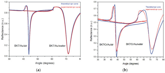 In addition, a different substrate with Cr/Au films was prepared. A chrome layer of approximately 30 Å was deposited by e-gun evaporation, and a gold thin film of 450 Å thickness was placed by thermal evaporation. The change in thickness from 500 Å to 450 Å for the Au thin film is for the widening of the SPR curve due to the adhesion of the Cr thin film; that is, the Cr layer is as thin as possible to avoid effects in the SPR curve of the Au. Then, the SPR signal with angular interrogation was measured to determine the characteristics of the chrome film using the previously obtained gold film parameters. In this case, the values for Cr thin film were d = 28 Å and N = 3.3101-4.2733i, using air and distilled water as the dielectric (see Figure 1b). In this process, a refractive index of N = 0.1758 – 3.3895i and 435 Å of thickness was obtained for the gold thin film.