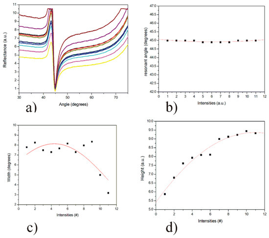One more critical factor in SPR measurements is the photodetector responsivity, which depends on the intensity of the light. If the intensity of the incident light on the surface of the photodetector is very high, the photodetector signal will be saturated. However, a very low light intensity may create a flat SPR curve. Therefore, the ideal incident light intensity is one that takes into account the value of the photodetector in the area near the critical angle without a light saturation. The incident intensity of the light is regulated using a neutral variable filter. These filters are usually made with chromium or chromium/nickel alloys to attenuate the light intensity without altering its polarization. Usually, the resonance angle will be the same for the SPR measurements at different intensities of incident light (see Figure 2a,b). However, the width (Figure 2c) and height (Figure 2d) of the response curves will be significantly affected, especially the height of the curve (as the intensity of the incident light increases it will cause an increase in the height of the SPR curve). This is essential to consider since, for biosensing measurements, the prism must be placed at the angle of half of the curve slope (highest sensitivity); that is, at half the height of the SPR curve.
