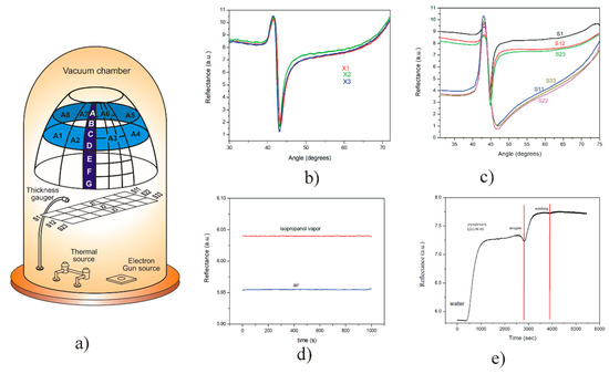 (a) Schematic representation of the location of substrates during deposition of Cr/Au with a rotation system (the upper cone) and without rotation (close to the thickness gauger in a vacuum chamber); (b) SPR curves of substrates X1, X2 and X3 that correspond to the central position of coated substrates without rotation (quartz monitor close to position X1), (c) SPR curves of the three substrates of the extreme left and extreme right in the system; (d) SPR measurement of the presence of isopropyl alcohol vapours in comparison with air, using a Cr/Au substrate of thickness 28/300 Å, based on measurements of intensity changes by SPR at a fixed angle; (e) SPR signal of the biofunctionalization of Cr/Au thin film corresponding to substrate X1, employing the EDC/NHS method for polyclonal antibody (50 µg mL−1) immobilization for an antigen-antibody recognition.