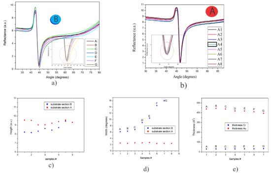 Figure 4d shows the half-width of the SPR curves of both A and B regions, denoting that the widths of the SPR curves of region A are very similar, while those of region B show more dispersion ranging from 6 to 16 degrees. The thickness of substrates from region B was estimated through a theoretical/experimental fitting analysis of the SPR curves, taking into account the values of complex refractive index obtained previously in Section 3.1, as shown in Figure 4e.