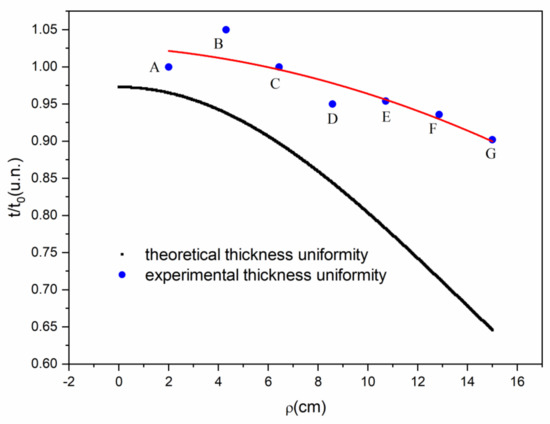 Figure 5 shows a representation of the relative thickness distribution of thin films obtained with a rotation system during the evaporation process. The uniformity of the thickness of each film was estimated from the fitted thickness, adjusted by the square least method, as shown in Figure 4a. Comparing the relative thickness (t/t0) with the uniformity equation, Equation (4) [12], which represents the evaporation of a surface rotating around the average distance R from the source, the deposition parameters of our substrates were: R = 15 cm, ρ = 22 cm, h = 45 cm, and a rotation speed of 6 rpm. Thus, the difference between the substrate on the upper end and the one of the lower end is 20%.