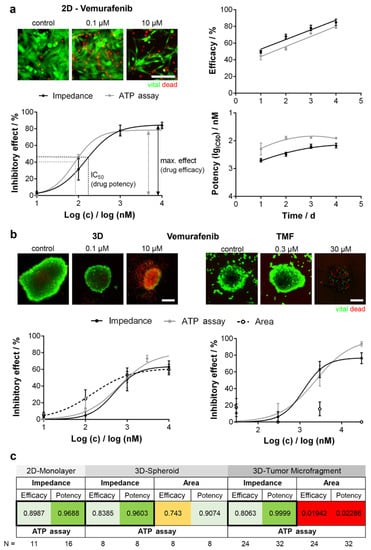 | Vemurafenib and other MAPK-targeting therapeutics | Melanoma | Cell viability | Comparability of chemosensitivity performed by correlation analysis, showing that impedance and ATP assay data were highly correlative (0.8 < r2 < 1.0) | ATP assay | [19] |