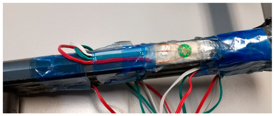 For all the strain gauges, an external Wheatstone quarter bridge of 120 Ω with a two lead-wire configuration has been settled and connected to several signal amplifiers (model NEC DC Strain Amplifier AS2101 manufactured by NEC SAN-EI Instruments, Ltd., Tokyo, Japan). The length of the lead-wires used in the strain gauges was short (50 cm), so it is concluded that the unbalanced condition in the bridge circuit can be neglected. However, the error produced by the lead-wire length has been mathematically subtracted from all the measured strain readings. The data acquisition system amplifies the signal from the strain gauges, while eliminating the signal noise. For that, the equipment used a low-pass filter of 10 Hz to all received signals before sending them to the digital signal converter. A calibration voltage of 10 V for all NEC SAN-EI channels was specified. This voltage value corresponds to a calibration strain set at 2000 µε. Afterwards, the measured strain values have been stored in an IMC CRONOS data acquisition equipment connected to a computer with a measurement tolerance of ±0.5 µε. Figure 4 shows the representation of the measurement system used for each strain gauge.