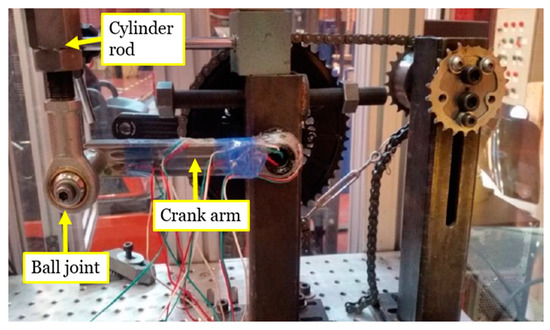 The crank arm was tested in an universal testing machine class II [19]. The load has been applied through the hydraulic actuator of the machine. For the load control, a load cell of 2500 N was used. The connection between the rod of the hydraulic cylinder and the axis of the pedal of the crank arm has been made with a ball joint (Figure 6), which guarantees the verticality of the axis of the cylinder rod and avoids transmitting reaction forces that could affect the normal operation of the testing machine. The employed data acquisition system is able to record at the same time all the strain measured by the strain gauges, the applied load and the displacement of the cylinder rod. The data recorded frequency was set at 1000 Hz. Figure 7 shows the schematic representation of the measurement system used in the test of the crank arm.