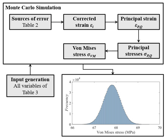 For the uncertainty quantification of the measurand, in this case the Von Mises stress, the law of propagation of uncertainty [21] can be used as well as alternative methods that use Monte Carlo simulations [22]. However, in both cases, it is necessary to know the probability distribution function of every considered error source.