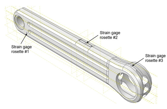 Since the stress distribution in the bicycle crank arm is unknown, it is decided to instrument it with three rectangular stacked grid 3-element strain gauge rosettes, model FRA-2-23-1L of 2 mm grid. This strain gauge configuration is appropriate when the directions of the principal strains are unknown [17]. Additionally, the stacked version is recommended when the space available for gauge installation is small and possible steep strain gradient can be expected in the surface of the test part. For a given active gauge length, all the strain gauges of the stacked rosette have their geometric centers on the same test part point, so they experiment the same strain field [17].