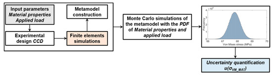 To reduce the number of simulations necessary to assess the uncertainty of a finite element model, it is commonly accepted to use metamodels constructed from the results of the several simulations generated with the variation of the input parameters [14,15,16,24]. These surrogate models provide a computationally efficient analysis. It is assumed that they represent the solution of the finite element model for the areas under study. Moreover, the uncertainties of the variables used in its construction can be propagated through random simulations with the Monte Carlo method. Then, the mean magnitude, the standard deviation and coverage limits are calculated, generally for a confidence level of 95% [14].