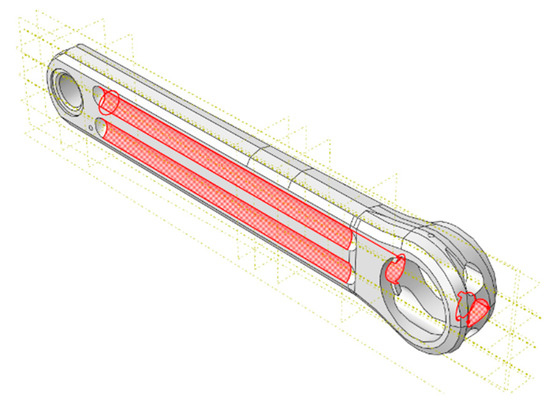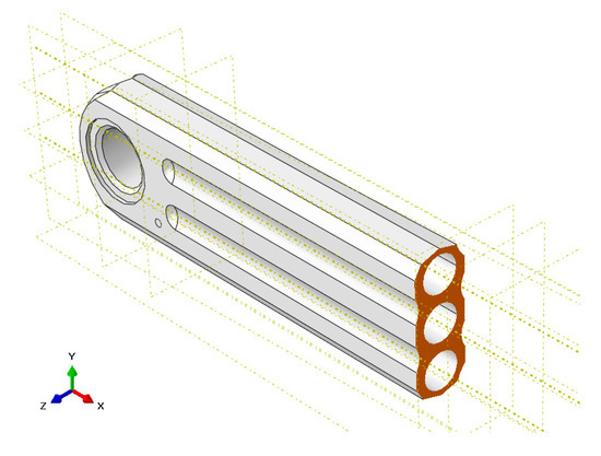For the Box–Behnken design, the geometrical recommendations given by the international standard ISO 2768-1:1989 have been followed [26]. The tolerances considered in the sensitivity analysis are circularity, symmetry and straightness. Figure 12 shows a section view of the crank arm where the three central blind holes can be visualized. The drills have been created through cutting revolutions around the X-axis, therefore the straightness has been analyzed only in the XY plane. The tolerance of symmetry has been studied between the two blind holes located on both sides of the central one. On the other hand, the circularity has been evaluated by modifying the diameter of all the holes, in accordance with the tolerances recommended by the standard [26].