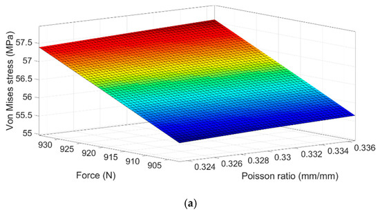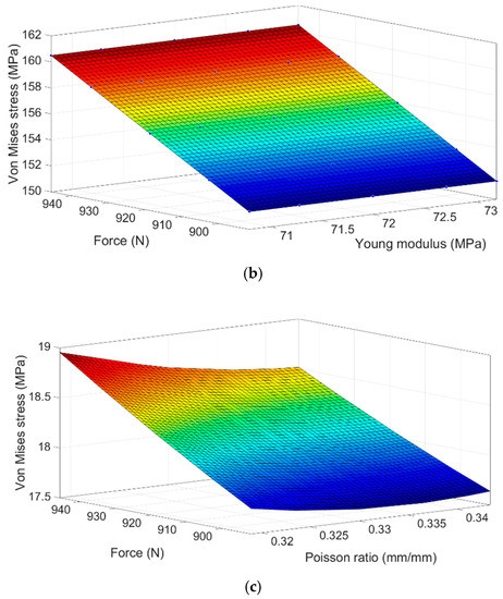 As can be seen in Figure 15, the analyzed zones are sensitive to variations in the value of the applied force. In rosette # 1 (Figure 15a), a higher applied force increases the stress by approximately 3.5%, whereas the increasing of the stress due to the Poisson ratio values does not exceed 0.3%. On the other hand, no interaction effect was observed in the zone of the rosette #2 (Figure 15b), so it can be concluded that this area is only sensitive to the uncertainty of the load. Figure 15c indicates that the combined effect of the load and the Poisson ratio affects the stress state in the zone occupied by rosette #3. A decrease of the Poisson ratio together with an increase of the applied force cause a higher Von Mises stress in this area (5%).
