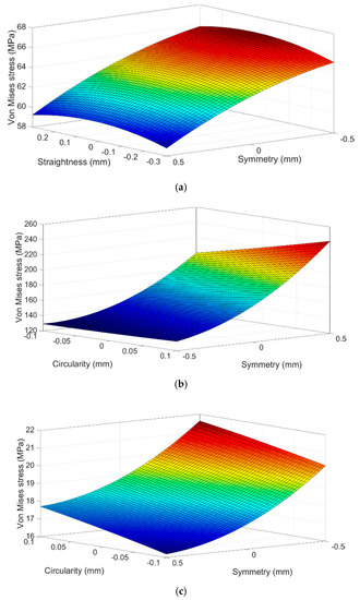 In Figure 16 it can be seen that the influence of tolerance of symmetry is present in the three response surfaces of the studied areas. In fact, this is the variable that has the greatest weight in the final value of the Von Mises stress. It has been observed that in both rosettes, #1 and #2, the interaction between the tolerances of circularity and symmetry causes a significant increase of the equivalent stress. The stress growth is slightly higher than 30% for rosette #1 and close to 45% for rosette #2. Therefore, it can be said that the uncertainties of the geometric tolerances produce a greater scattering of the stress compared to the properties of the material and applied load.