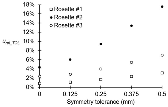 In order to analyze the influence of the symmetry tolerance on the stresses of the rosettes zones, additional Monte Carlo simulations have been performed with the previous metamodels, for smaller symmetry tolerances. Figure 17 shows the evolution of the relative uncertainties of the numerical Von Mises stresses for the three rosettes. It can be seen that the area of rosette # 2 is the most sensitive to the increase of the symmetry tolerance and the rosette #1 is the less sensitive.