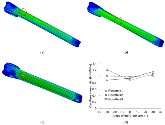Figure 19 shows the results of the first comparison procedure. It can be seen that the location area of maximum Von Mises stress (red circle) changes with the angle of the crank arm. The potential damage zone is between the base of the crank arm and the area of rosette #2. The maximum stress can be on the same surface (Figure 19a) or on the opposite side (Figure 19c) from where rosette #2 is bonded. Moreover, in both cases, the maximum Von Mises stress is about 1.2 times higher than the stress of the rosette #2. Furthermore, it was confirmed that the greatest stress is found when the position angle is equal to zero, that is, when the crank arm axis is parallel to the horizontal plane.