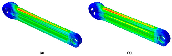 Figure 21 shows the Von Mises stress distribution map of the original and the new crank arm. It has been observed that a decrease of 15% in the weight of the crank arm causes an increase of the maximum stress of 5.5%.