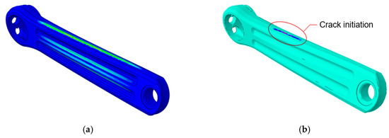 (a) Permanent deformation and (b) scalar stiffness degradation of the new crank arm model.