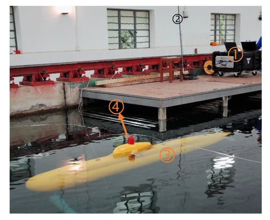 Figure 1. The xAUV sailing in the towing tank. (1) Portable surface monitor; (2) Surface WIFI antenna; (3) xAUV; (4) Integrated WIFI&GPS antenna.