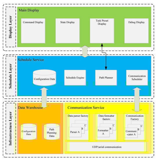 The monitor software is a supervisory control and data acquisition (SCADA) system [16] and was developed based on the factory method [17], which is a widely used software design pattern concluding the experience in coding, making the code easier to understand, and ensuring the program reliability [18]. As is shown in Figure 4, the monitoring software is developed with three functional layers: display layer, schedule layer, and infrastructure layer. Screens listed in the display layer are designed for human-computer interaction, including state monitoring, sending commands, path planning, etc. The schedule engine in schedule layer takes charge of coordinating the function blocks according to the predefined time sequence and determining the program execution cycle by timers. There are many basic function blocks and data warehouses in infrastructure layer, where a function block can be abstracted into a proprietary factory and a data block can be compared to materials in the factory. With this software construction, the monitor software is highly integrated.