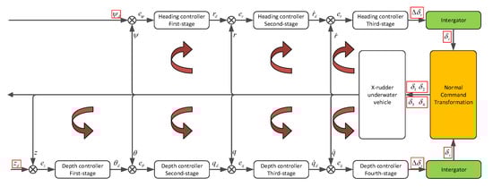 The principle diagram of DIFC is presented in Figure 8. There is a heading controller and a depth controller that each controller has multiple stages forming different control loops. The DIFC will produce the increment of virtual rudder commands ( Δ δ s , Δ δ r ) , then the integrator sums up the increments and gives out the virtual rudder commands which will be transformed into the actuator’s control inputs ( δ i ,   i = 1 , 2 , 3 , 4 ) by normal command transformation later.