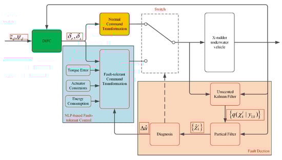 In recent years, a great diversity of autonomous underwater vehicles (AUVs) has been brought into reality, ranging in size from man-portable lightweight ones to large sized vehicles over 10 m in length, with commercial, research, military and other applications. In the pursuit of better maneuverability, X-rudder autonomous underwater vehicles (hereinafter abbreviated as xAUVs) were developed. The first X-rudder underwater vehicle was a research submarine, on which the US Navy carried out numerous maneuver experiments and concluded that the maneuverability is superior to that of all other submarines [1]. Dubbioso, et al. [2] confirmed the superior turning abilities of the X-rudder underwater vehicles by conducting numerical simulations and compared the results to available experimental data. Other scientists [3] have pointed out that xAUVs can still remain operational when the rudder gets stuck, which means the xAUVs have better safety. In addition, xAUVs have better rudder effect, indirectly help improving propulsive efficiency, and are free of damage while docking on the seabed. For these reasons, X-rudders have been adopted more and more in AUV designs around the world. In the civilian field, JAMSTEC (Yokosuka, Japan) has developed a cruising xAUV that can maintain a fixed posture in the horizontal and vertical plane in order to perform exploration in hydrothermal activity areas [4]. MARIN (city, The Netherlands) [5,6] investigated and promoted the capabilities of computational fluid dynamics (CFD) as a tool to conduct 6-DOF free-running maneuvering simulations on a scale physical model equipped with an X-rudder. Although the advantages of the xAUVs are obvious, it is more difficult to control the xAUVs than traditional AUVs, because every control surface of the xAUVs contributes effects on both the horizontal subsystem and the vertical subsystem while in the traditional AUVs they do not. Therefore, control-related problems, such as control allocation, fault detection and fault-tolerant control, should not be ignored and need further research.