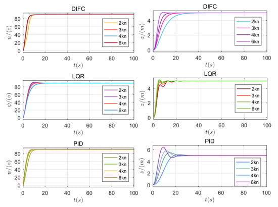 The first scenario contains a heading and depth tracking situation under a cruising speed of 3 kn and the results are shown in Figure 11. The heading control results are nearly the same. The actual course is approaching to 90° gradually and tends to stabilize after 20 s, which indicates that the heading control is satisfactory for DIFC, LQR and PID. However, the depth control results are different. Depth control by DIFC is smoother than with the others, while LQR behaves more rapidly but with slight fluctuations, and PID is accompanied by small overshoot. Therefore, it can be concluded that the DIFC helps to achieve smooth control of heading and depth, which is consistent with the functionality of tanh function. Simulation results under lower velocity (2 kn) and higher velocity (4 kn, 6 kn) are presented in Figure 12. According to the left three figures, it can be seen that the results under different velocities are nearly the same, which indicates that the surge velocity has little effect on the heading control for any of the methods. Depth control behaves differently under different velocity and this can be found in right three figures. It is obvious that the surge velocity has an effect on depth approaching speed. The slower the velocity is, the slower the depth approaches. In addition, overshoot varies obviously with the velocity in LQR and PID, while there is nearly no overshoot in DIFC and the depth control remain steady all the time. This demonstrates that DIFC has better adaptation to surge velocity comparing to LQR and PID in depth control.