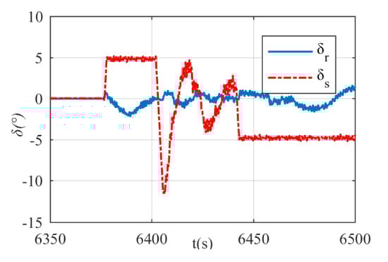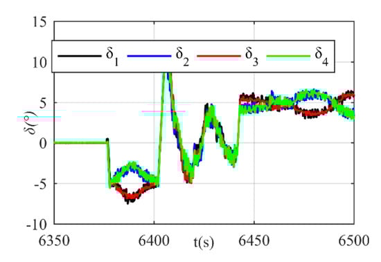 Figure 17. Virtual rudder commands from DIFC. The first stage (6375–6400 s), The second stage (6400–6445 s), The third stage (6445–6500 s).