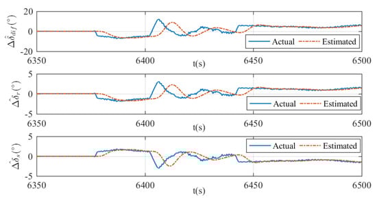 Figure 20. Estimation of Δ u in case 2. The estimated differential angle (top), the estimated virtual vertical rudder angle (middle), and the estimated virtual horizontal rudder angle (bottom).
