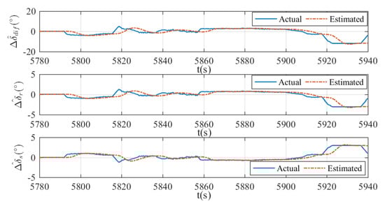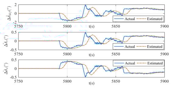 where means the Hadamard product. The fault detection results and the estimation of rudder effect deduction Δ u ^ are presented in Figure 19, Figure 20 and Figure 21. In all figures, the moment of fault being triggered can be captured when the actual deduction begins to deviate from zero. In addition, changes of actual deduction mean changes of virtual rudder angles. If the actual deduction keeps constant, one can determine that the virtual rudder angles are also fixed. As is shown in these figures, the estimated deductions are following the actual deductions properly when the virtual rudder angles are changing, for instance, 6375–6450 s in Figure 19, 5890–5920 s in Figure 20, and 5790–5860 s in Figure 21. After the virtual rudder angles stabilize, the actual and estimated deductions approach to the same constant value finally, for example 6450–6500 s in Figure 19, 5920–5939 s in Figure 20, and 5860–5900 s in Figure 21. In summary, the results indicate that the proposed fault detection method can achieve a good estimation of rudder effect deduction with reasonable errors. However, time lag and estimation errors are existent. This is a common phenomenon in the state estimation process and it can be improved by increasing the gains in the filters. In practice, this is a trade-off problem between update rate and system robustness. Usually, the greater the gains are, the faster the update rate is, but the worse the robustness becomes, or vice versa. In terms of this xAUV, slow update rate has no effect on the fault detection results, because the faults are usually irreversible once it happened and it is certain that the faults can be detected finally.