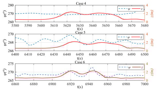 Rudder jam is another type of fault which directly affects maneuverability and may bring great danger to the xAUV. In order to verify the robustness of the NLP-based fault-tolerant control proposed in this paper, tests against rudder jam will be carried out in this subsection. The rudder jam settings are listed in Table 3. As for cases 4–6, the tasks assigned to the xAUV are the same as described in Section 5.1.