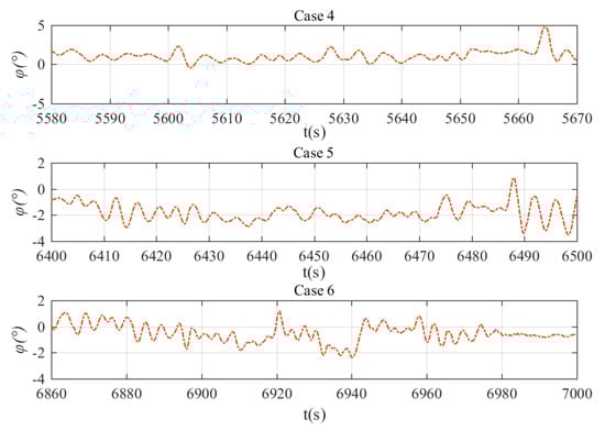 Figure 24. Roll angle during heading and depth control with rudder jam. Roll angle in case 4 (top), roll angle in case 5 (middle), and roll angle in case 6 (bottom).