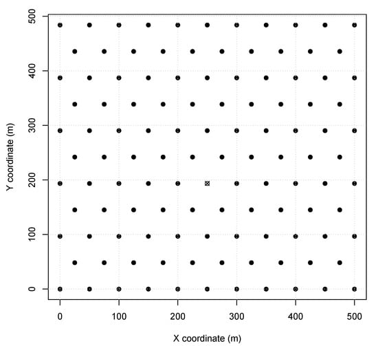 The proposed algorithm is evaluated usingCPS scenarios using SmartData and TSTP (see Section 4) with a single central sink according to our Network Model (see Section 2). To validate our algorithm and optimize the parameters, simulations were performed using OMNet++ (version 4.6) with the Castalia framework (version 3.3) to acquire the network delivery ratio. The scenarios represent different aspects of Wireless CPS deployment, such as node distances and placements, based on monitoring environments and industry floor. The scenarios are similar to the ones used in other works [16,17,18]. Scenario 1 represents a typical monitoring environment, like a solar field monitoring or a soil moisture irrigation system. Nodes in this scenario are configured with TX power of (60 range) and the MAC period of . In this scenario, a 500 field is covered with 115 sensor nodes responding to a central sink node. A depiction of Scenario 1 node placement can be found in Figure 1. Furthermore, all the sensor nodes were instantiated as SmartData responding to the Interest messages described in Table 1, where and are abstracted for simplification as they are not relevant to the simulation. Also is considered equal to .