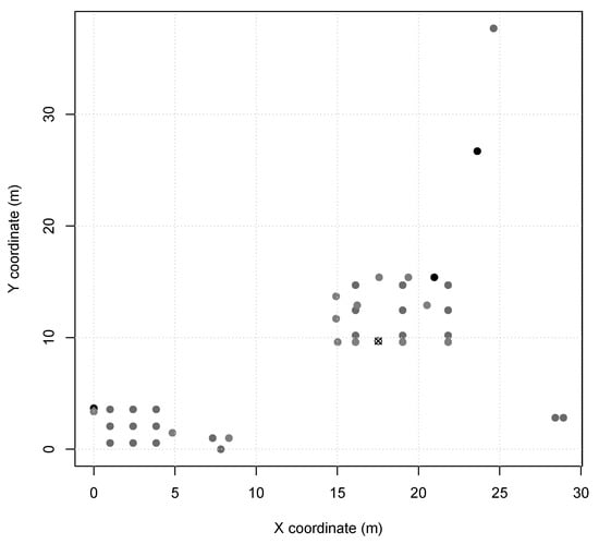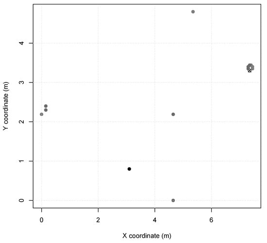 Scenario 2 and 3 represents indoor industry applications, e.g., an autonomous assembly system or a temperature control on a power-plant room. Nodes in these scenarios are configured with TX power of (60 m range, same as Scenario 1), and the MAC period of in Scenario 2 and in Scenario 3. Scenario 2 presents node distribution in a small area of 7 m × 5 m (Figure 2), with 13 sensor nodes and 1 sink node. Scenario 3 presents two node clusters in a larger area of 30 m × 40 m (Figure 3), with 40 sensor nodes and 1 sink node. Furthermore, Scenarios 2 and 3 nodes are instantiated as SmartData responding to Interest messages as described in Table 3, where and are abstracted for simplification as they are not relevant to the simulation.
