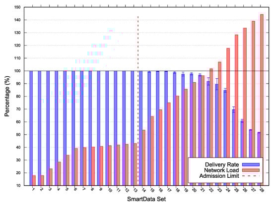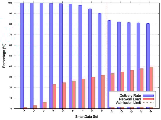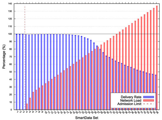For Scenario 3 we used a MAC period of , MAC duty-cycling of , no MAC reservation, MAC transmission capacity () of , and a of 0. Scenario 3 (results depicted in Figure 6) acceptance limit was at SmartData set . The estimated network load at the admission limit was less than ; however, the delivery ratio for the next SmartData set is less than once the elapsed time for the response messages became higher than their expiry.