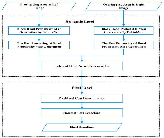 The process flow for the proposed method is shown in Figure 1. The proposed algorithm optimizes the seamlines at the semantic and pixel level. The D-LinkNet neural network is adopted to achieve the road probability map of the overlapping area both in the left and right image. At the semantic level, the PRAs are determined by binarizing the road probability map. In this step, most of the roads will be included in the PRAs. The PRAs are the priority areas which the seamlines cross. At the pixel level, the Dijkstra’s shortest path searching algorithm is adopted to find the final seamlines.