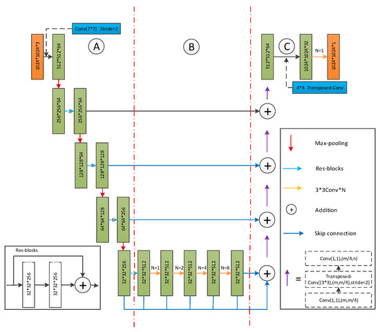 D-LinkNet [34] is adopted as a basic CNN model of the proposed method due to its excellent performance in 2018’s DeepGlobe road extraction challenge and broad use as the baseline in road segmentation tasks [35]. It uses the typical encoder-decoder architecture inherited from LinkNet and adds the delated convolution part to acquire and ensemble multi-scale features to enlarge the receptive field, which is able to handle a road’s properties, such as connectivity, complexity, and long span, to some extent [36]. Specifically, ResNet34 [37] is pretrained on ImageNet [38] and used as the encoder part of D-LinkNet, and several dilated convolution layers with skip connections are placed in the center part to enhance the reception ability. The decoder part uses transposed convolution [39] layers to conduct upsampling, restoring the resolution of the feature map from one that is downsampled to the original one. The architecture of the D-LinkNet is presented in Figure 2.