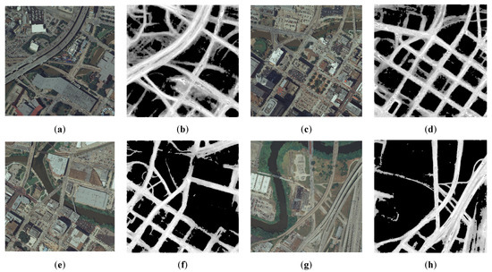 Road probability map generation by D-LinkNet: (a), (c), (e), and (g) are original images, (b), (d), (f), and (h) are road probability maps generation by D-LinkNet of (a), (c), (e), and (g).