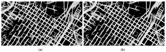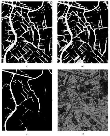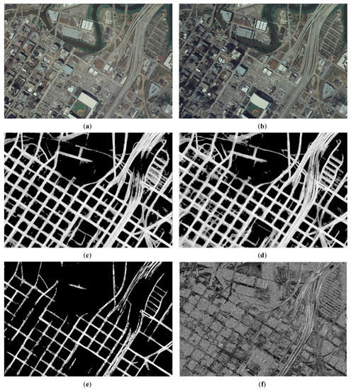 In Figure 5, Figure 6 and Figure 7, (a) illustrates the overlapping area of the left image; (b) illustrates the overlapping area of the right image; (c) illustrates the road probability map of the overlapping area of the left image; (d) illustrates the road probability map of the overlapping area of the right image; (e) illustrates the PRAs of the overlapping area; and (f) illustrates the NCC cost of the overlapping area. Figure 5c, Figure 6c, and Figure 7c illustrate the road probability map of the overlapping area of the left image of Datasets A, B, and C, respectively. The larger the pixel value, the more likely it is to be determined as a road. Figure 5d, Figure 6d, and Figure 7d illustrate the road probability map of the overlapping area of the right image of Datasets A, B, and C, respectively. The larger the pixel value, the more likely it is to be determined as a road. Most of the roads in the orthoimages are extracted. In order to enhance the appearance of the road probability map, the stretch method of histogram equalize is used to adjust the value of the road probability map. Because of the differences between the overlapping area of the left and right image, the road probability maps obtained by them are also not the same, which are illustrated in (c) and (d) of Figure 5, Figure 6 and Figure 7. With the help of the Otsu method [41,42], the preferred road areas of the left and right image are determined by the road probability threshold for binarization, respectively. The final PRAs of the overlapping are defined from the preferred road areas of left and right image by Equation (4). In Figure 5e, Figure 6e, and Figure 7e, the white areas are the PRAs of the overlapping areas, which are the priority areas that the seamlines pass. Most roads of the overlapping area are included in the PRAs, which meets our requirement. Figure 5f, Figure 6f, and Figure 7f illustrate the NCC cost of the overlapping area of Datasets A, B, and C, respectively. The greater the brightness value of a pixel, the greater the NCC cost. The NCC cost is an effective method for assessing the difference of the pixel-level.
