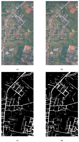 The D-LinkNet neural network was trained and tested with a single NVIDIA GeForce GTX 1080Ti using the TensorFlow library in python in Linux. The training set was composed of 6226 images from the DeepGlobe Road Extraction dataset [35] and 1000 image sets of data for manually marking roads with 0.5-m resolution remote sensing images. The image size was 1024 × 1024. Details for training a D-LinkNet-34 network are as follows: Batchsize = 1, epoch = 200, train_best_loss = 50, learning_rate = 2 × 10−4, and the loss function defined as a mixture of binary cross entropy loss representing the error between pixels with a dice coefficient loss suitable for the error between batches based on the IOU(intersection over union) as an evaluation index. The output of the neural network is the probability of judging whether the pixel belongs to a road. It took almost 50 h to complete the network training. Once the network training is completed, the network can be applied to other datasets of different areas. After training, the error train loss is 0.18796 and the accuracy rate is 0.81204.