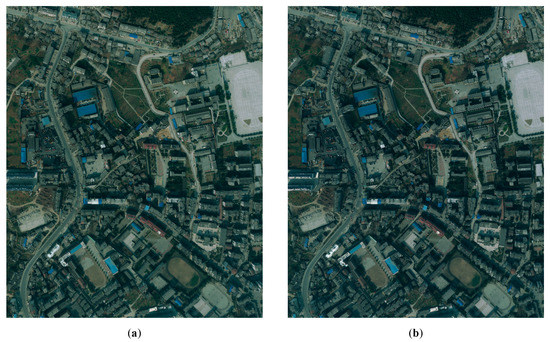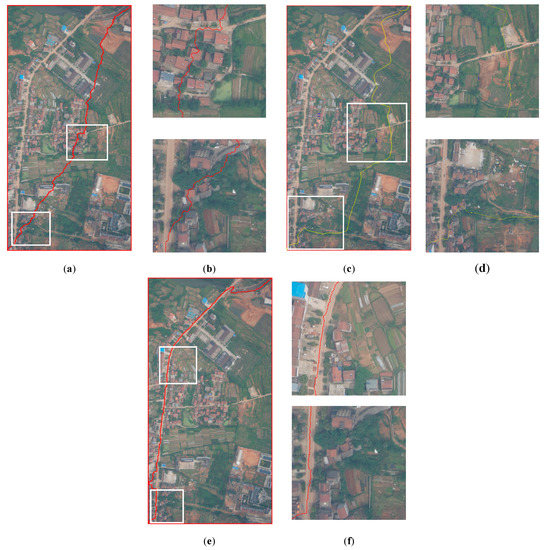 The coverage area of Dataset B is located in the suburbs area of large cities, for which the spatial resolution is 0.2 m. There is much agricultural land, woodland, and bare land in the image. There are some original villages and factories in it. A main road runs from north to south. The seamline determination by Dijkstra’s algorithm crossed six obvious objects, which is shown in Figure 9a. The details of the crossed buildings are illustrated in Figure 9b. The seamline determination by the OrthoVista algorithm crossed six obvious objects, which is shown in Figure 9c. The details of the crossed buildings are illustrated in Figure 9d. Seamline determination by the proposed algorithm crossed no obvious objects and was along the north–south main road, which is shown in Figure 9e. The details of the crossed buildings are illustrated in Figure 9f. As shown in Figure 6e, during the optimization of the seamline at the semantic level, the proposed algorithms almost included the roads in PRAs. By giving the PRAs area a smaller weight, which is shown in Equation (7), the seamline mainly passes through the PRAs, and the final seamline is mainly along the roads, bypassing most of the areas with large relief displacement.
