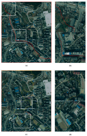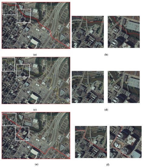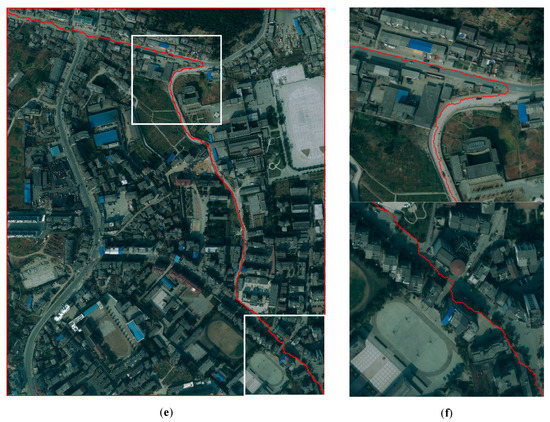 The coverage area of Dataset C is located in the central urban area of a medium-sized city, for which the spatial resolution is 0.5 m. In the image, in addition to buildings and residential areas, there is much agricultural land and woodland. The seamline determination by Dijkstra’s algorithm crossed two obvious objects, which is shown in Figure 10a. It crossed two buildings, which is illustrated in Figure 10b. The seamline determination by the OrthoVista algorithm crossed 11 obvious objects, which is shown in Figure 10c. Figure 10d shows that the seamline crossed several buildings. Seamline determination by the proposed algorithm crossed two obvious objects, which is shown in Figure 10e. The details of the two crossed buildings are illustrated in Figure 10f. As shown in Figure 7e, during optimization of the seamline at the semantic level, the proposed algorithms almost included the roads in PRAs. By giving the PRAs area a smaller weight, which is shown in Equation (7), the seamline mainly passes through the PRAs, and the final seamline is mainly along the roads, bypassing most of the areas with large relief displacement.