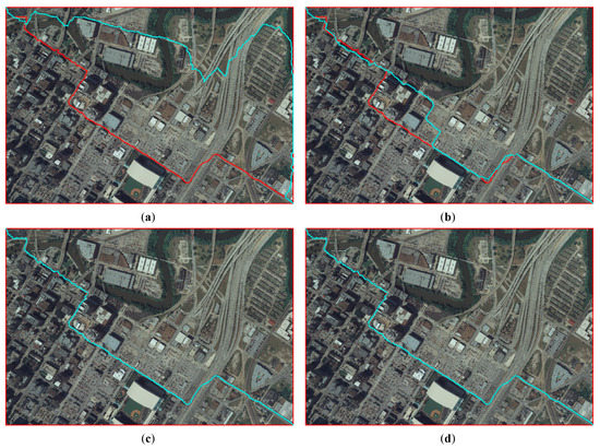Experiments of seamline determination for Dataset A with different values of w: (a) w is 0.001 (red line) and w is 0.1 (cyan line), (b) w is 0.001 (red line) and w is 0.01 (cyan line), (c) w is 0.001 (red line) and w is 0.0001 (cyan line), and (d) w is 0.001 (red line) and w is 0.00001 (cyan line).