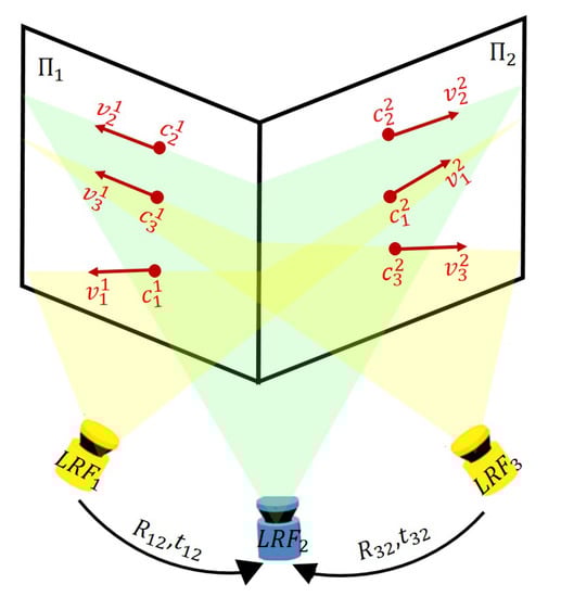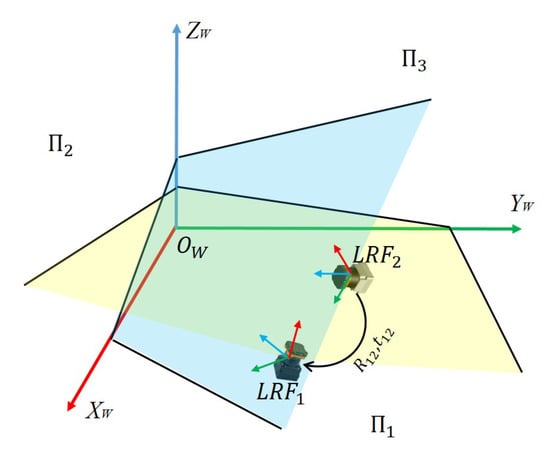 Then, according to the steps in Section 2.4, we calculated the extrinsic parameters between LRF1, LRF2, and LRF3. Let the extrinsic parameters calculated by the proposed WI method be denoted as ,, , and , we have