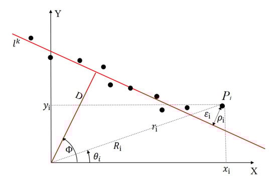 The basic principle of calibrating the extrinsic parameters between a single LRF and the trihedron is to find the coordinates of corresponding points in the laser coordinate system and the world coordinate system and then calculate the extrinsic parameters. As the trihedron model showed in Figure 2b, the scanning plane of the LRF intersects with the three planes of the trihedron; therefore, forming three intersecting lines, and three straight lines intersect with each other, which forms three intersecting points: , , and . The coordinates of these points can be obtained in the laser coordinate system by fitting the laser points into lines. At the same time, the three points and the origin of the trihedron form a vertical pyramid in the world coordinate system, which can be regarded as a special form of P3P problem. By solving the P3P problem, the coordinates of the three points in the world coordinate system can be represented as , , and . Finally, the extrinsic parameters between the laser coordinate system and the world coordinate system are solved by the three corresponding points. The solution involves two main processes: the first step is fitting the laser points in the laser coordinate system and calculating the coordinates of the three intersecting points under the circumstance that there are ranging noise in laser points data. The second step is constructing and solving the P3P problem. Section 2.2 below describes the method of fitting a straight line considering the ranging noise in laser points data, and Section 2.3 describes the solution of this special P3P problem.