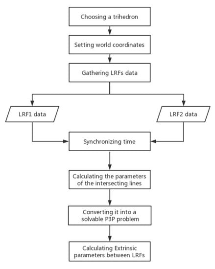 Section 2.2 and Section 2.3 specifically describe the method of determining the extrinsic parameters between the world coordinate system and the LRF coordinate system. As for two LRFs, we first get extrinsic parameters between the two LRFs and the trihedral world coordinate system using this method, and then we calculate the extrinsic parameters between two LRFs according to the method described in Section 2.1. The overall processes are shown in Figure 4, which mainly includes three important steps: laser data collection, laser points fitting, and extrinsic calibration.