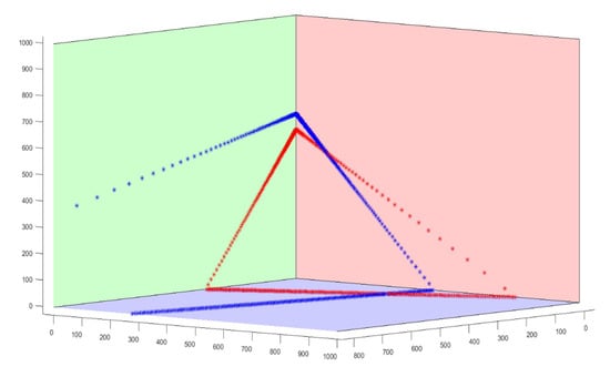 In the simulation experiment, we simulated the extrinsic parameters calibration between two LRFs, called LRF1 and LRF2. First, three 1 m × 1 m planes that are perpendicular to each other constituted a trihedron. The intersecting lines of the three planes were used to establish the world coordinate system. The LRF scanning parameters were set according to the actual LRF devices (Hokuyo UTM-30lx-em), which were used in the real data experiment. The scanning angle of the LRFs was 270 degrees and the scanning Angle resolution was 0.25 degrees. Second, we set the position and posture of two LRFs in the world coordinate system. Among them, the rotation angle vector between the LRF1 coordinate system and the world coordinate system was set as degrees, and the translation vector between them was mm. The rotation angle vector between the LRF2 coordinate system and the world coordinate system was set as degrees, and the translation vector between them was mm. Third, we generated the simulation data. We simulated the working process of the two LRFs and obtained the laser points, which were the intersection points between the laser beams and the trihedral planes. Then, adding zero-mean-value random noises with Gaussian distribution into the laser points data. To verify the performance of our method under different noise level, the distance values of simulated LRFs were added Gauss noise with a mean value of zero and a standard deviation from 3 mm to 30 mm. The simulation data of the two LRFs and a trihedron are shown in Figure 5, where the quadrilateral of three different colors represent three planes of the trihedron, the red star-shaped points represent the simulation data of LRF1, and the blue star-shaped points represent the simulation data of LRF2.
