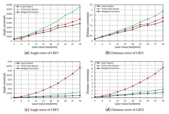 The experiments were conducted under different Gaussian noise levels from 3 mm to 30 mm. At each noise level, the experiments were repeated for 100 times, and the mean value of the evaluating indicators was calculated. The results were drawn in Figure 6. Among them, the angle and distance errors of LRF1 are shown in Figure 6a,b and the angle and distance errors of LRF2 are shown in Figure 6c,d. The result of LS method, TLS method, and WI method are, respectively, represented by red square, green triangle, and black cross. It can be seen that with the continuous increase of ranging noise, the angle errors and distance errors of the fitting line are increasing in three methods.