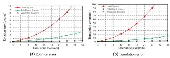 Similar to Section 3.1.1, we conducted the experiments at each ranging noise level from 3 mm to 30 mm. The above experiments were repeated 100 times, and the mean errors of the extrinsic parameters were calculated using the LS method, TLS method, and WI method. The results are shown in Figure 7, where Figure 7a,b, respectively, show the error of the rotation matrix and the translation vector. Generally, both the rotation and translation error of the proposed WI method are the least among the three methods, and they change little with the increase of ranging noise. As shown in Figure 7, when the ranging noise level is increased from 3 mm to 30 mm, the rotation error of the Euler angle increased from 0.07 degrees to 0.38 degrees, and the error of the translation vector increased from 0.59 mm to 2.95 mm. Compared with the ranging noises added on the two LRFs, the errors of the extrinsic parameters were always kept at a low level. Even if ranging noises with variance 30 mm were added to the data, the rotation and translation error of the proposed method were less than 0.4 degrees and 3 mm, respectively.