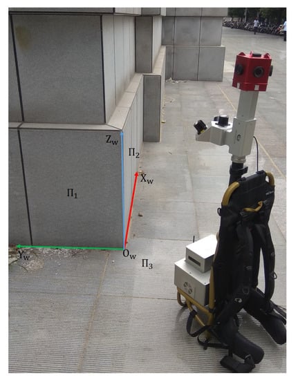 In the following experiments, we selected a common vertical corner as the calibration pattern at an outdoor building. As shown in Figure 9, two planes of the building and the ground together constitute the trihedron described in Section 2.1. Three planes are denoted as , , and , and the world coordinate system is established by taking three edges of the trihedron as X, Y, and Z axis and the vertex of the trihedron as the origin.