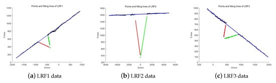 A group of laser data was collected with three LRFs of the SLAM device, and the linear equations of laser points on three planes were fitted by the proposed WI method. The result is shown in Figure 10, the laser data and fitting lines of LRF1, LRF2, and LRF3 were shown from left to right. The black points represent the laser points on the three planes of the trihedron, and the red, green, and blue lines represent the line on the plane , , and , respectively.