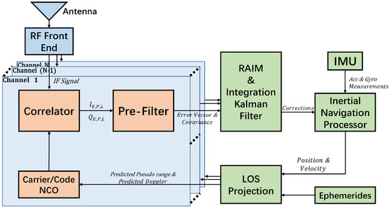 The integration of GNSS and INS can provide more accurate and reliable navigation information than either system alone, primarily in degraded signal environments. Traditional integration employs a loosely- or tightly-coupled architecture. The Deep Integration (DI) is promoted as having a superior performance to loose and tight coupling in scenarios with low C/N0 ratios. In a deeply integrated system, the INS can measure vehicle dynamics, which is fed into receiver tracking loops to reduce the tracking loop bandwidth and improve satellite signal acquisition ability. Furthermore, lowering the bandwidth results in greater noise suppression. In turn, the performance of the receiver is to be improved because of longer time integration and optimization of tracking loop parameters [6]. Edwards et al. described the implementation details of an embedded deeply integrated Global Positioning System (GPS)/INS software receiver on an FPGA platform [7]. A federated ultra-tightly coupled (UTC) algorithm based on pre-filters is proposed and the performance in high dynamic environments of the system is presented in [8]. The performance of a non-coherent deeply integrated navigation algorithm is compared with a tightly coupled navigation algorithm [9]. In [10], field tests of a UTC architecture with a Micro-Electro-Mechanical System (MEMS) IMU are performed both in indoor and outdoor environments.