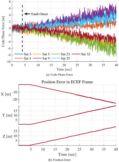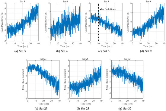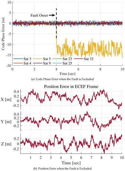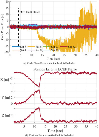 After the fault appearance at s, the code phase error estimation of Satellite 5 has an abrupt change. Then, the code phase error decreases and tends towards stability, as shown in Figure 7a. The reason the code phase error estimation of Satellite 5 at s is about m rather than m is that pre-filer has inertial and smooth properties. The rapid fault propagation among channels can be observed after s. The code phase error estimations of contaminated channels float more or less.