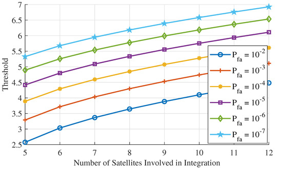 The fault detection test is a binary hypothesis test. At the epoch k, if the statistic s is below the threshold , which is a prepared constant, the pseudorange error estimations are considered reliable. On the other hand, if the statistic exceeds the threshold, they are assumed as unsafe. Under fault-free conditions, obeys a chi-squared distribution with the freedom of degrees. Once a fault with a magnitude of occurs in one channel’s signal, will be a noncentral chi-squared distribution with the freedom of . Under normal conditions, the threshold can be selected analytically [20]. It is a function of the probability of false alarms () and the number of visible satellites (N). Given the , the can be calculated by inverting the incomplete gamma function: